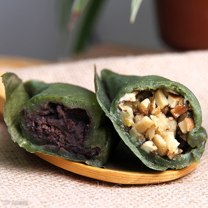 甜口的清明果是豆沙馅,采用精选的赤豆制成,艾草的清香包裹着豆沙的香甜,一口咬下去是大大的满足。