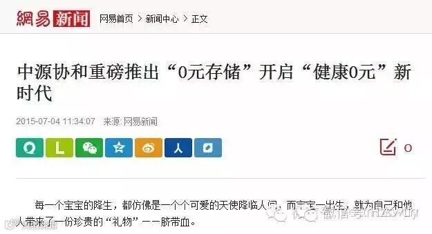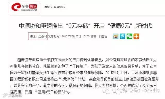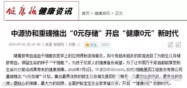 2015年7月1日,中源协和细胞基因工程股份有限公司重磅推出了“0元存储”计划,创新的产品、服务组合,颠覆性的“健康0元”理念,立刻在行业内外引发强烈震动。新颖的健康理念,前所未有的服务模式,更吸引了主流媒体的高度关注,许多知名报刊、网站以图文并茂的形式,大篇幅报道中源协和“0元存储”计划,积极向社会推广这种时尚、个性化的健康新观念。