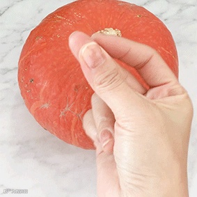2.用勺或手将南瓜瓤掏出,选定准备雕刻的地方,将那块瓜皮刮薄;用小刀沿图案轮廓雕刻,完成后将残留的笔迹擦去。