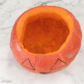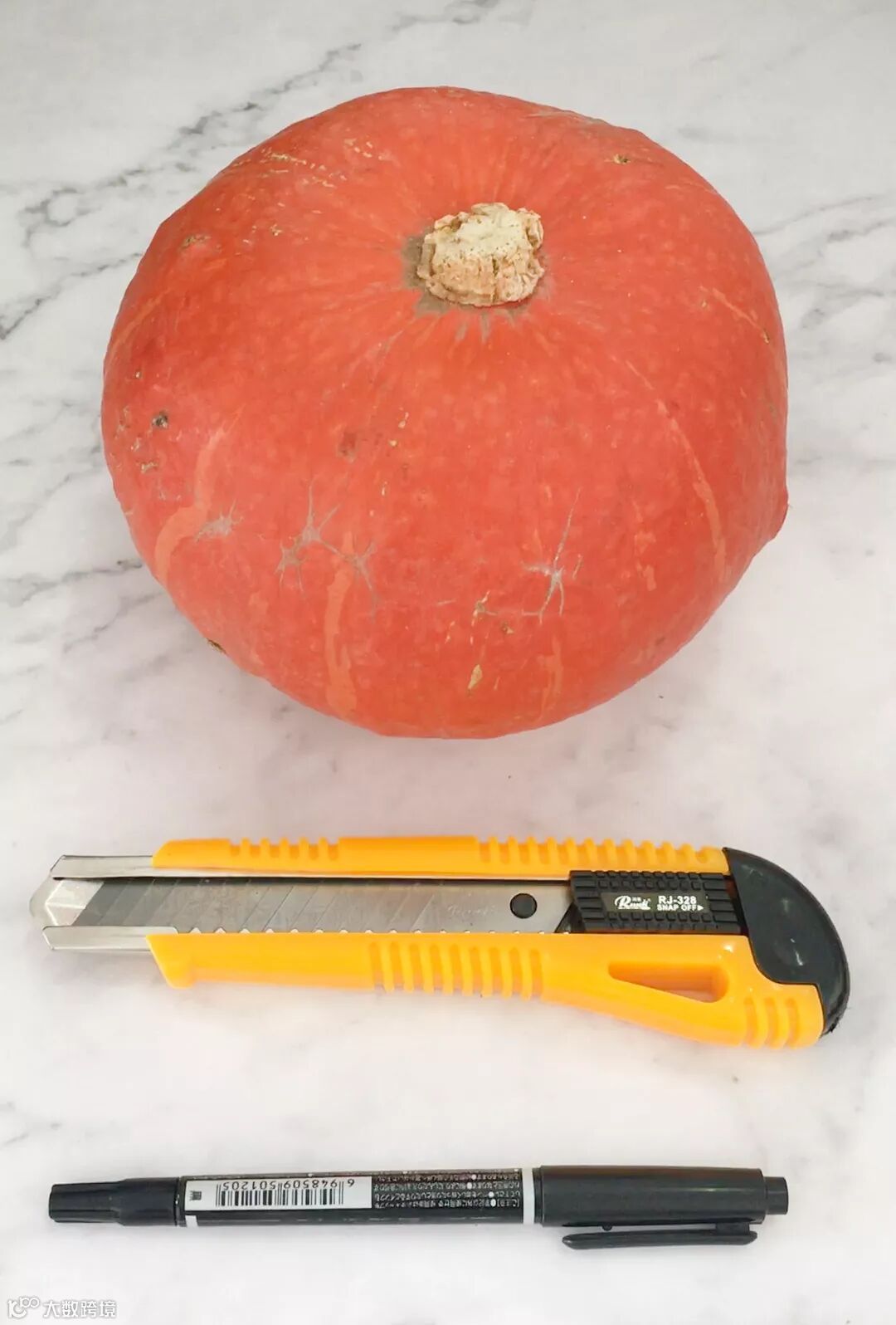 1.挑选一只圆润的南瓜,在带把儿的一端切个帽子,切面尽量保持平整,用记号笔在瓜皮上画出鬼脸或自己喜欢的图案。