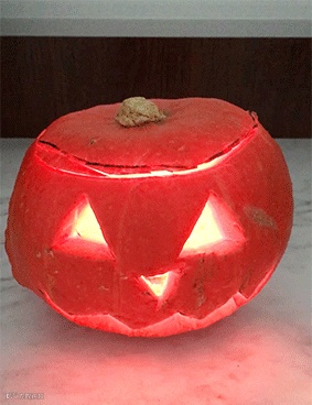 3.用牙签将蜡烛和南瓜固定在底部,点燃,大功告成。