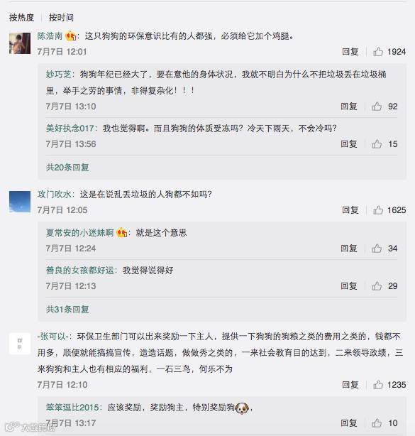 和虎哥一样,在网上对于“环保狗”的微博下,网友们也纷纷为狗狗点赞,吐槽乱扔垃圾的行为。