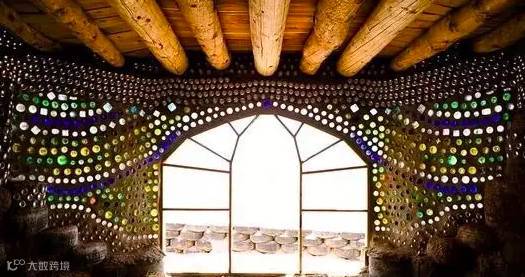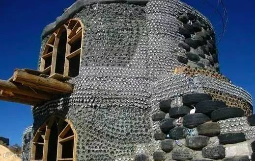 这是美国建筑师麦克·莱诺兹的作品。他的作品外形千奇百怪,而且都遵循着同一种理念:不需任何外接水电排污系统,能够自己发电,调温,生产食物,收集循环用水;基本建材全是垃圾,废弃轮胎、易拉罐、饮料瓶等。他给它们起了个名字:地球之舟Earthship。图中的房子用轮胎和瓶子筑成的墙非常厚实,足以抵抗九级地震。