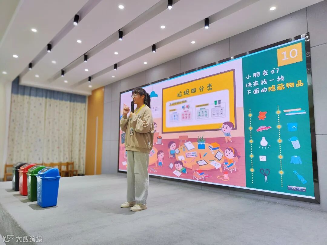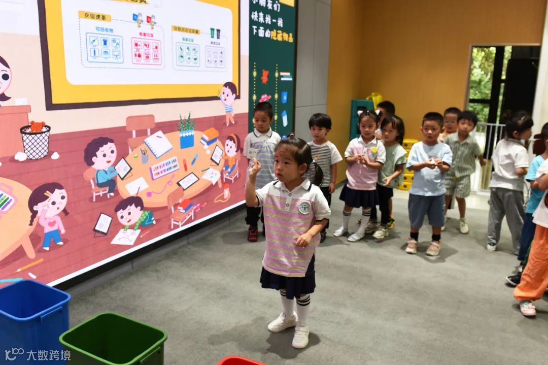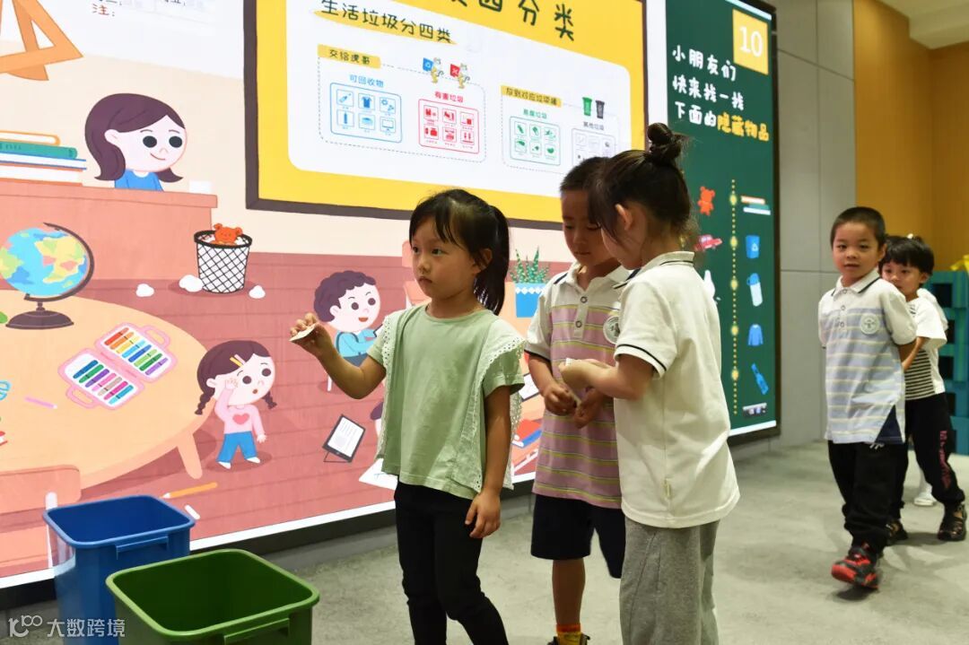 为了加深孩子的动手分类能力,同时检验大家课堂掌握的垃圾分类知识理解程度,孩子们需要将手中的垃圾图样卡投放到正确的垃圾桶道具内。