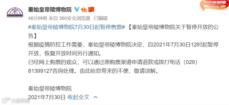 7月30日,秦始皇帝陵博物院发布通知称,根据疫情防控工作需要,秦始皇帝陵博物院决定,自2021年7月30日12时起暂停开放,恢复开放时间另行通知。