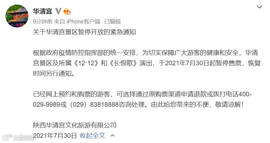 7月30日,陕西华清宫文化旅游有限公司发布通知,华清宫景区暂停开放。
