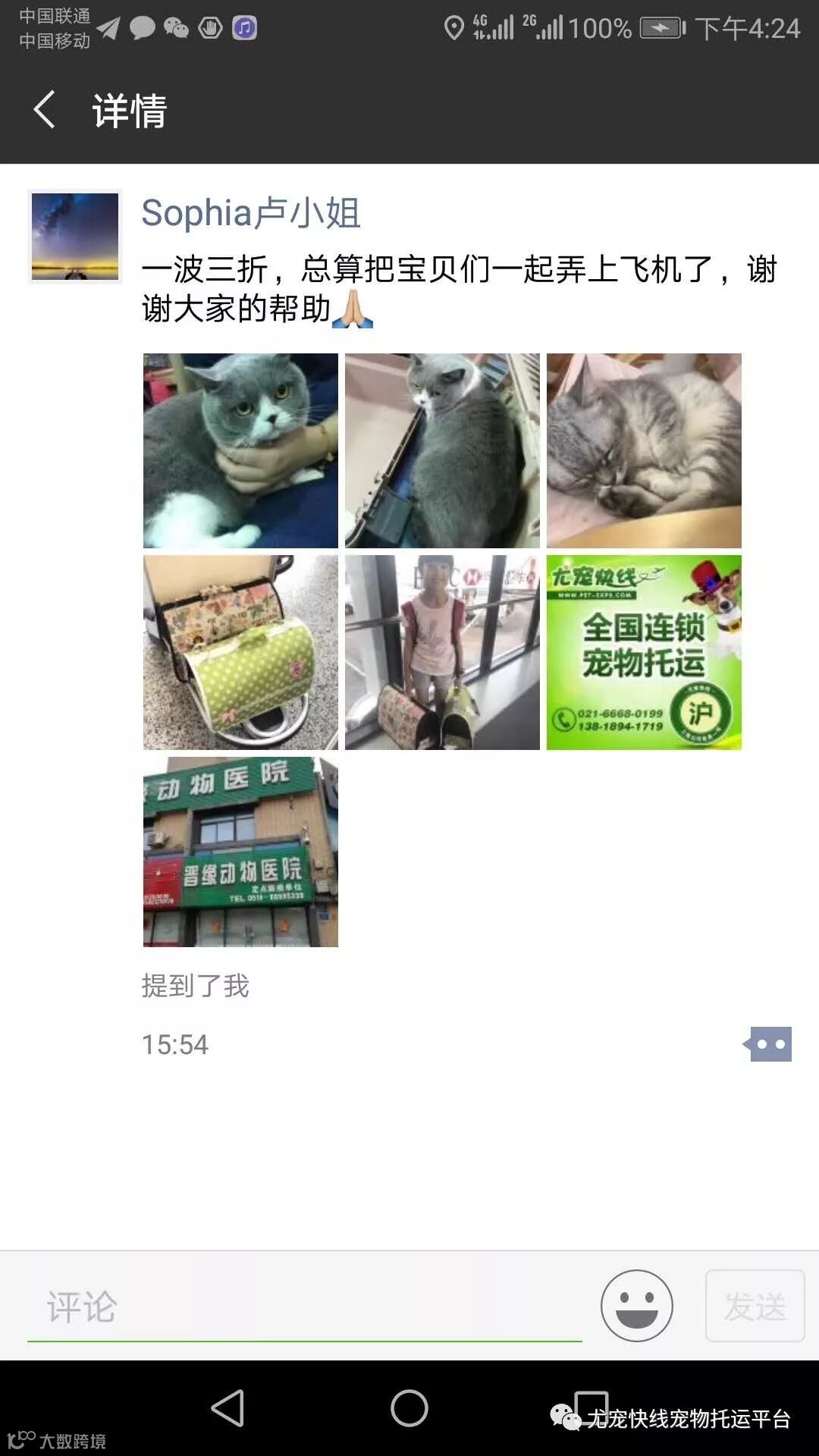 一个从山东托运宠物到美国的客户说,我想托运我的齐大宝,花了很多时间在找托运公司,没有找到一家让我放心的宠物托运公司,国内的人都是油嘴滑舌,说一套做一套,我很不放心,这是我的“儿子”,我担心他会受苦,对比很多家过后,我选择你们家公司,说实话一开始我也不相信你们,直到收到狗狗,我真正的放心了,你们是很有爱心的商家,很细心很有耐心很周到,服务非常到位,是我误会你们了,我一定会一直帮你们宣传,我几十个群,里面全是爱宠人士,我都给你们介绍,只要有人要托运,我就推荐你们。
