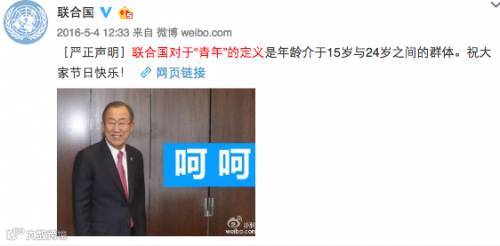 2016年5月4日,联合国通过微博更新称,联合国对于“青年”的定义是年龄介于15岁与24岁之间的群体。