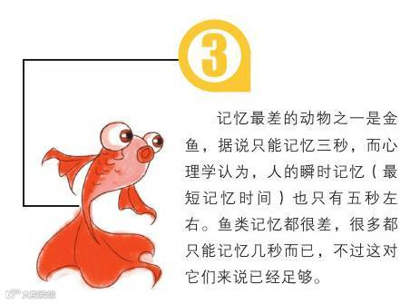 记忆最差的动物之一是金鱼,据说只能记忆三秒,而心理学认为,人的瞬间记忆(最短记忆时间)也只有五秒左右。鱼类记忆都很差,很多都只能记忆几秒而已,不过这对它们来说已经足够。