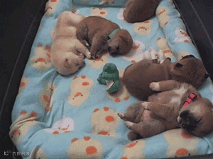 一个女士微笑着说:“当然可以,孩子。”说完,她转身从一个狗舍里取出一个铺得很柔软的盒子。那里面躺着6只毛茸茸的小狗,3只黑颜色的,3只黄褐色的,可爱极了。小狗们都睡着了。