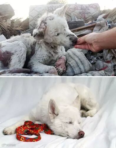 这只小狗被发现一直生活在一个垃圾堆中,天知道,它怎么混成这个样子。下面的图是它被救三个月之后的样子。那次救援,改变了它的生活。