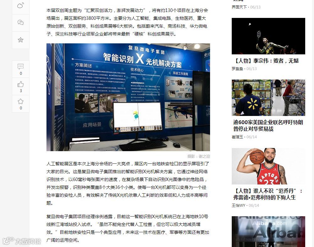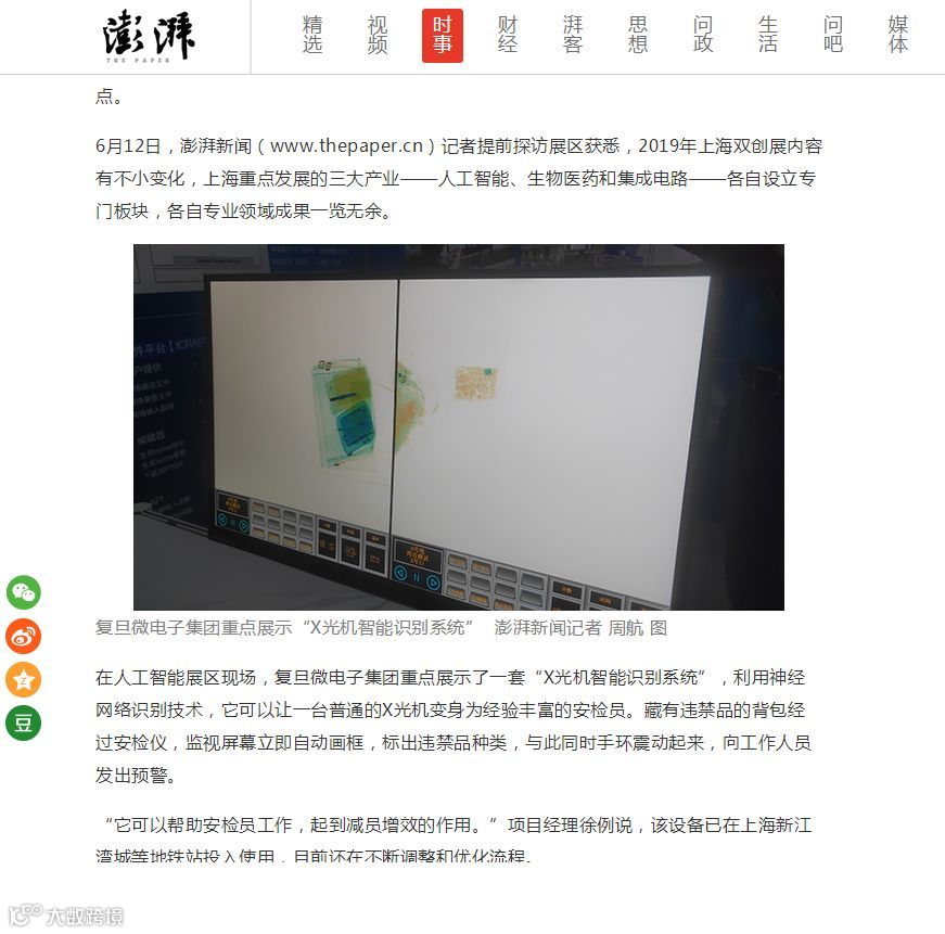 约130项涉及人工智能、集成电路、生物医药、重大原始创新、双创服务等五大领域、代表着上海双创活力与水平的项目创新创业成果与观众见面。上海复旦微电子集团股份有限公司受邀在人工智能主题展区展示集高算力智算平台与神经网络技术于一体的“智能识别X光机系统解决方案”。
