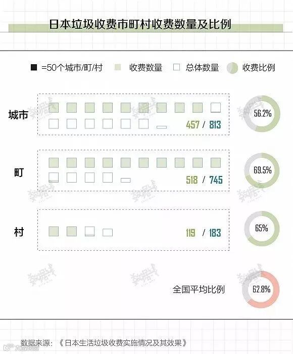 根据日本东洋大学经济学系教授山谷修作的调查统计,截至2015年4月,日本全国1741个市、町、村中实施垃圾收费的共有1094个,收费实施率为62.8%。其中城市收费率较低,仅为56.2%。