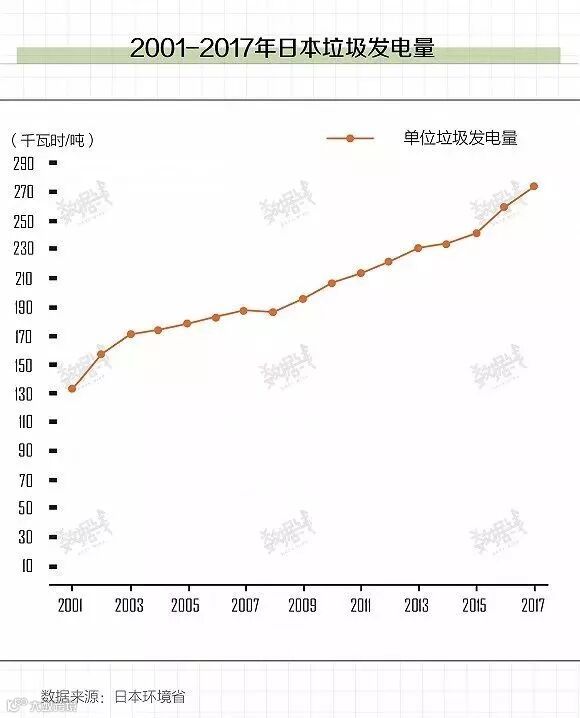 1997年,大阪市丰能町的“二噁英事件”迫使日本政府制定了新的法律来规范二噁英排放,并且提高了对焚烧厂的要求。21世纪以来,日本单位垃圾发电量逐年上升,2016年达到260千瓦时/吨,较2000年水平翻了一倍。