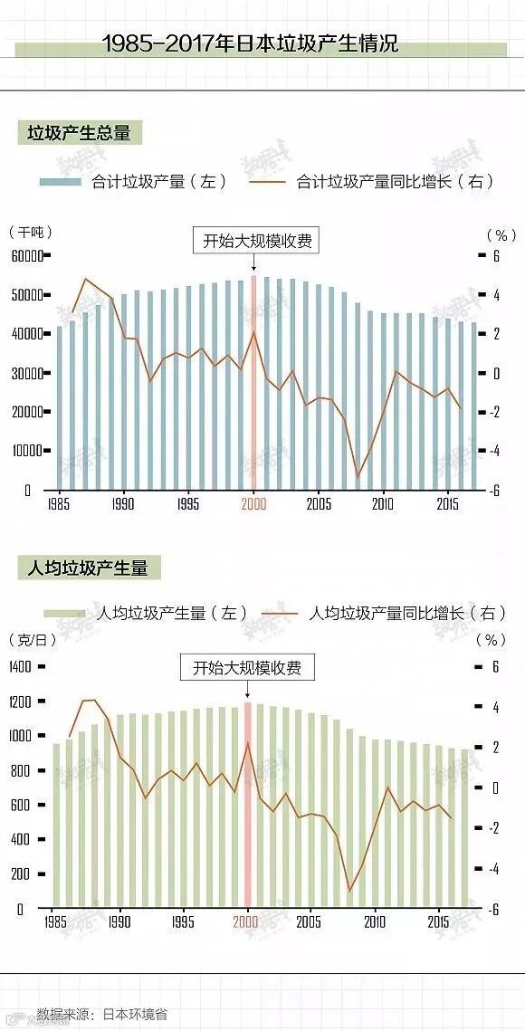 虽然日本从20世纪80年就已开始实行垃圾分类,但根据日本环境省数据,日本垃圾减量化效果从2000年才开始显现,核心原因是垃圾收费制度的大规模实施。