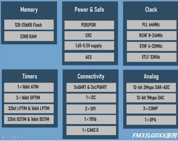 FM33LG0集成了一个高精度基准源VREF,经过片内电路升压后可产生多档可配置的基准电压。其产生的基准电压除了给内部电路使用,还可以供片外使用,其驱动能力为10mA。