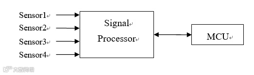 SP芯片外接4个传感器,得到4路输入信号。每一路输入信号中都包含噪声,以及淹没在噪声中的有用信号。SP芯片的功能是:接受MCU的指令,从输入信号中提取有用信号,并将有用信号的包络波形以数字信号的形式源源不断传送给MCU。