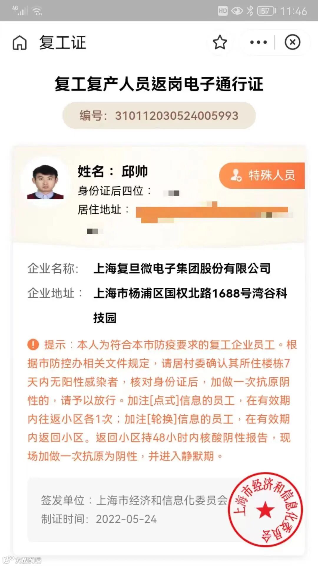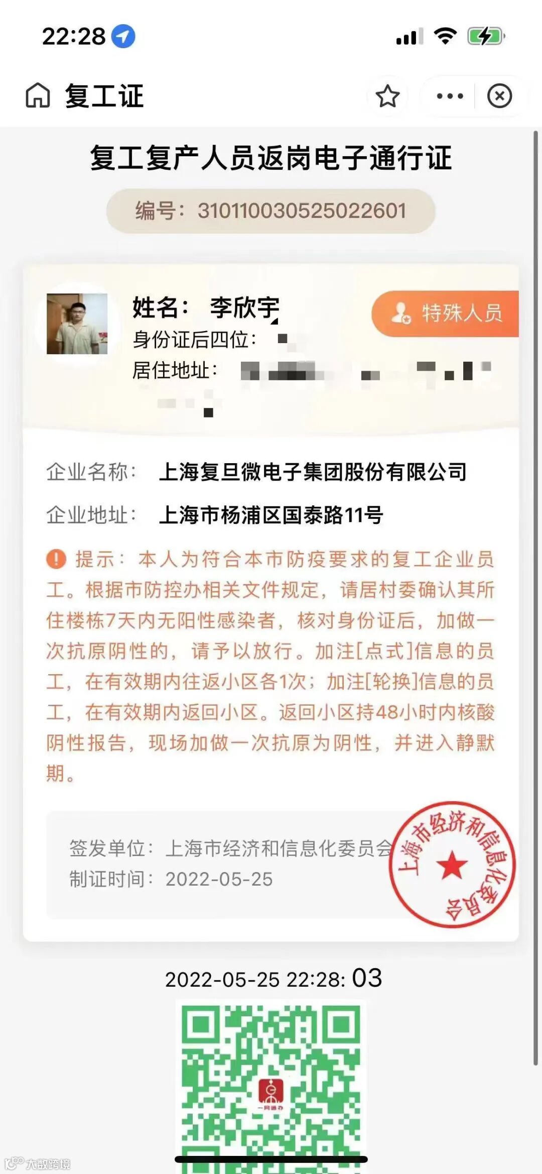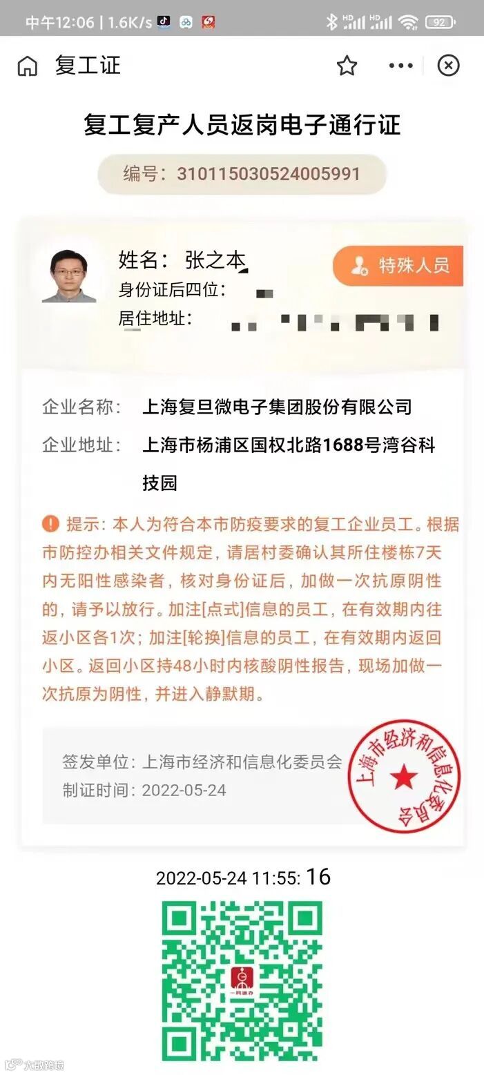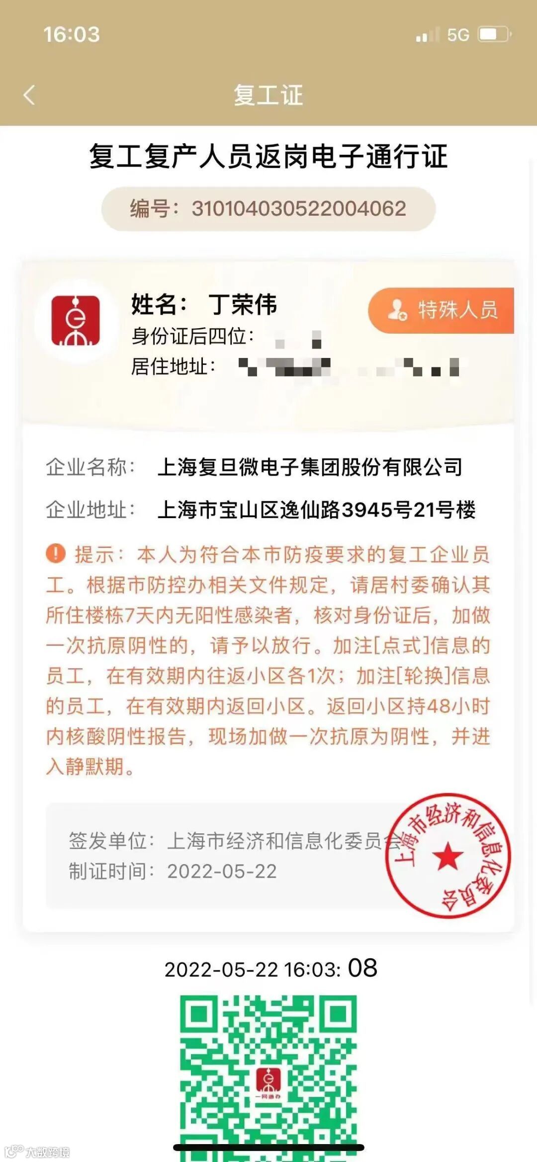 随着上海疫情防控形势持续稳中向好,复工复产已按下“快进键”。集成了身份证明、工作证明、48小时核酸检测报告等内容的“复工码”是打好疫情防控和复工复产“组合拳”的智慧数字底牌。上海复旦微电子集团股份有限公司已有大量员工获得复工码。随着复工人数不断增多,复旦微也将迎来大面积复工。曙光来临,一切向好。