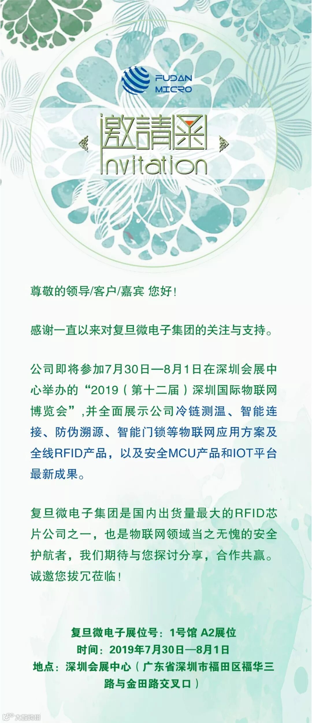 复旦微电子集团7月30日—8月1日,深圳一年一度的物联网盛会——“2019第十二届深圳国际物联网博览会”即将拉开帷幕。复旦微电子集团又将和大家见面啦!