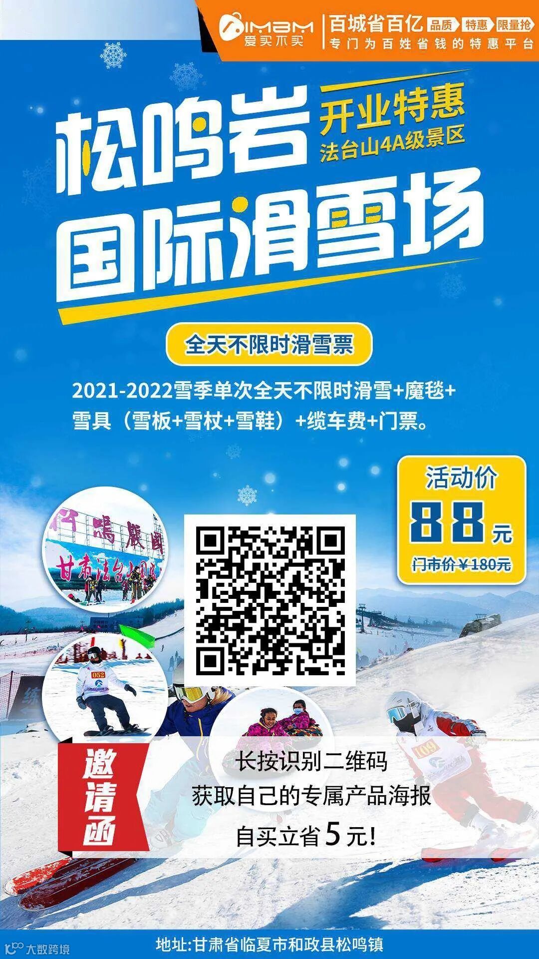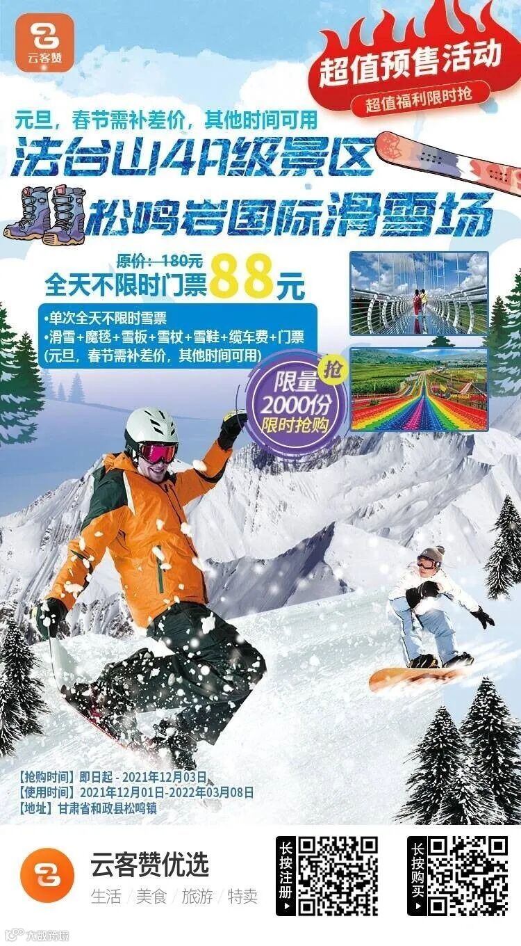平日、周末全天不限时滑雪票,现预售价为88元。