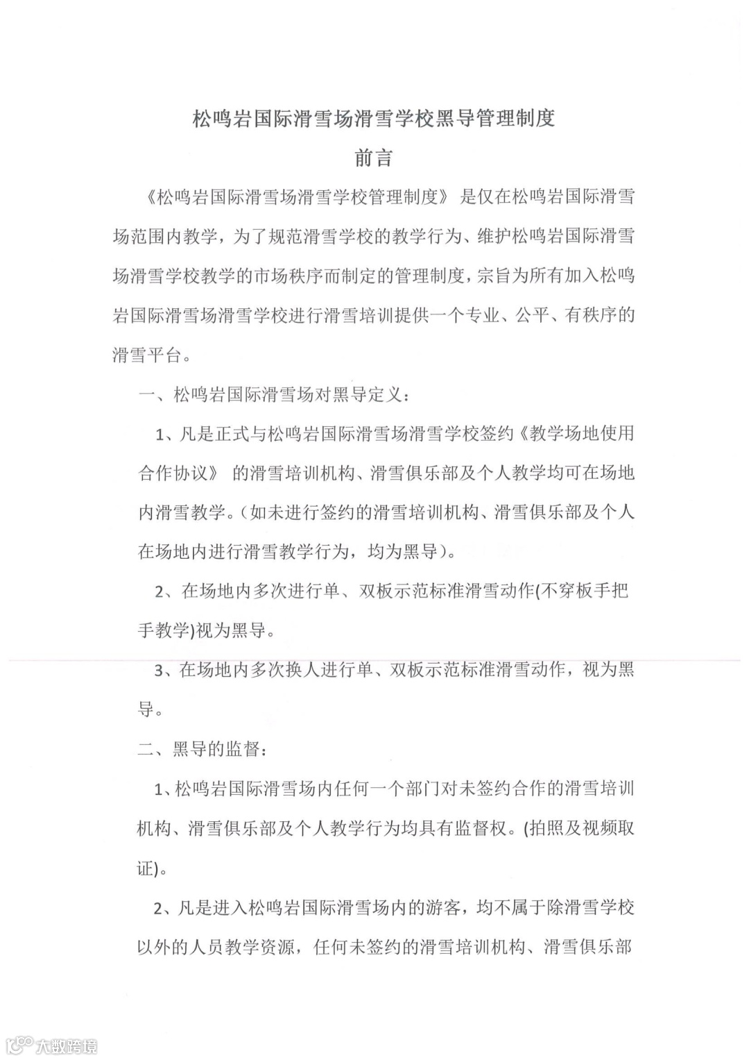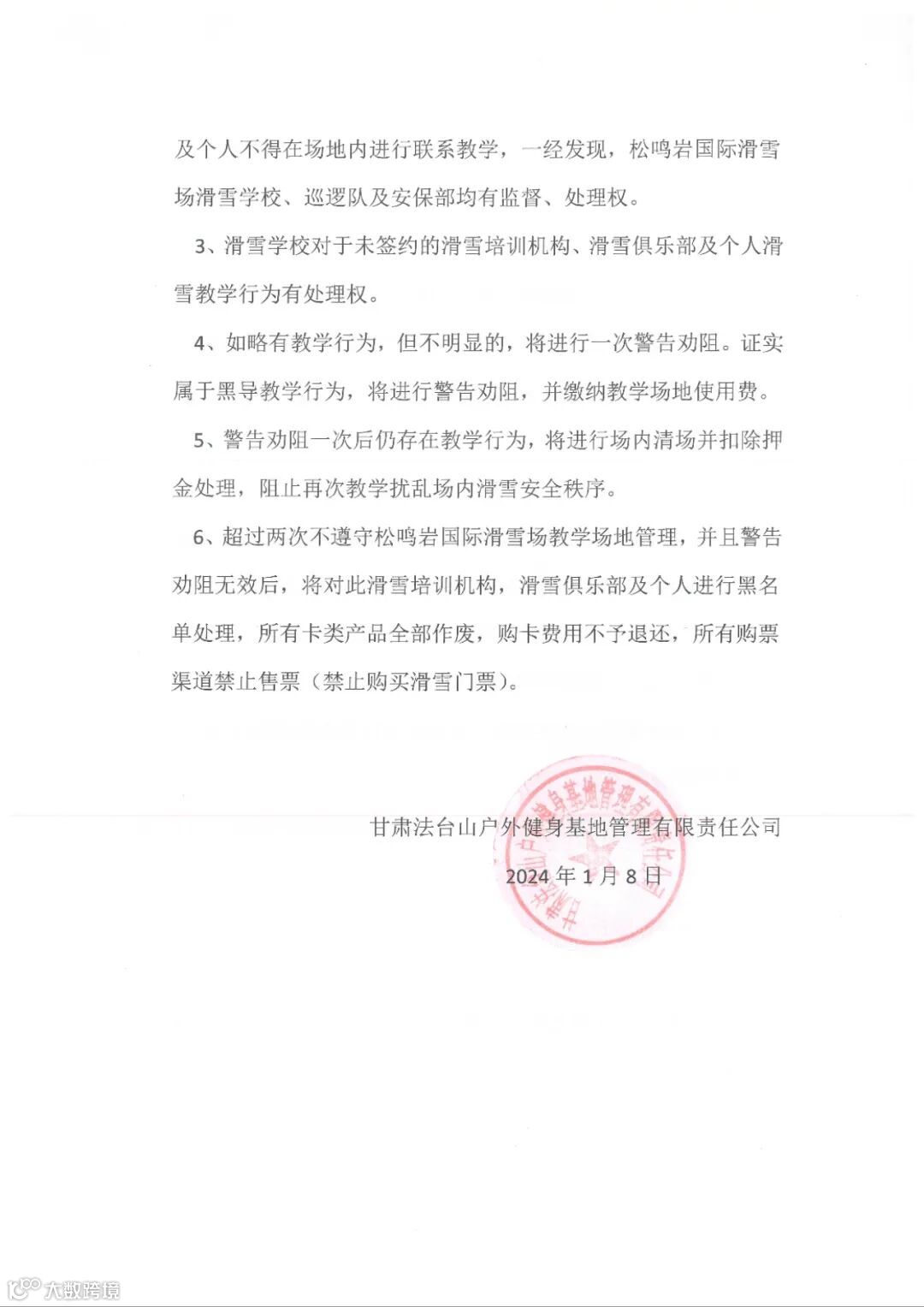 为维护松鸣岩国际滑雪场滑雪学校的正常教学秩序,维护游客的人身安全及合法权益,避免产生纠纷,松鸣岩国际滑雪场从2024年1月8日起禁止黑导在我雪场进行教学行为,特发布以下公告:
