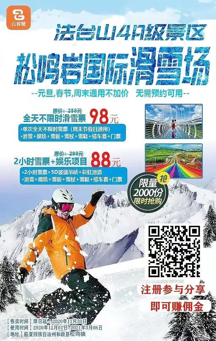 含:2020年至2021年整个雪季单次全天不限时滑雪+魔毯+雪具(雪板+雪杖+雪鞋)+缆车费+门票