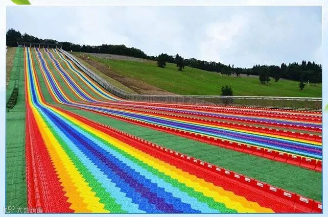 绚丽的彩虹滑道,高高地挂在山坡上,像条彩虹瀑布。从高高的云端出发,从长长的滑道飞驰而下,整个身体仿佛从彩虹中穿过,能够体验到不一样 的速度与激情。