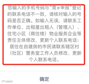 2.“莞e申报”登记个人信息不准确。该情况是由于当前输入的手机号码与“莞e申报”登记的联系电话不一致,导致未能获取验证码。请联系工作单位、出租屋出租人(管理人)、住宅小区(商住楼)物业服务企业等责任主体修改、更新个人联系电话;居住在自建房的市民请联系辖区村(社区)警务室工作人员修改、更新个人联系电话。修改、更新个人联系电话后,再进行个人信息申报。
