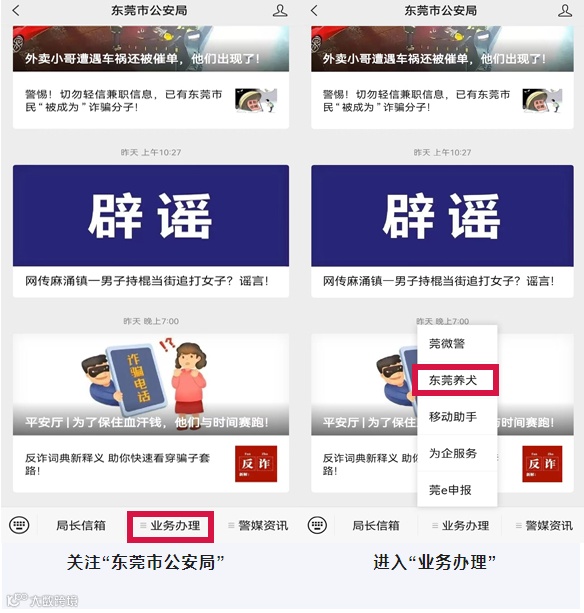 ▲或者关注“东莞市公安局微信”公众号,业务管理→东莞养犬,也能进入该小程序。