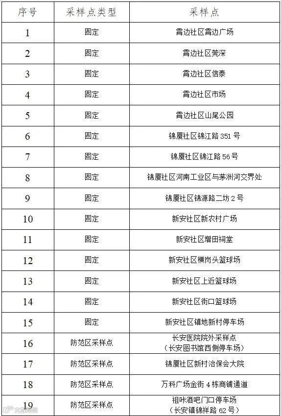 共设置19个固定核酸检测点(含4个防范区内核酸检测点,具体见下表),请市民选择就近检测点进行检测。