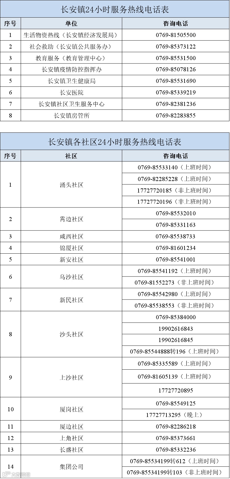 (六)全力做好居家生活及医疗健康服务保障。确保区域内生活必需品供应充足、价格稳定。保障区域内孕妇、独居老人、长期病患者等特殊人群就医需求。长安镇建立镇村两级服务保障队伍,设立镇村两级24小时热线电话(具体详见下表),及时响应市民诉求。
