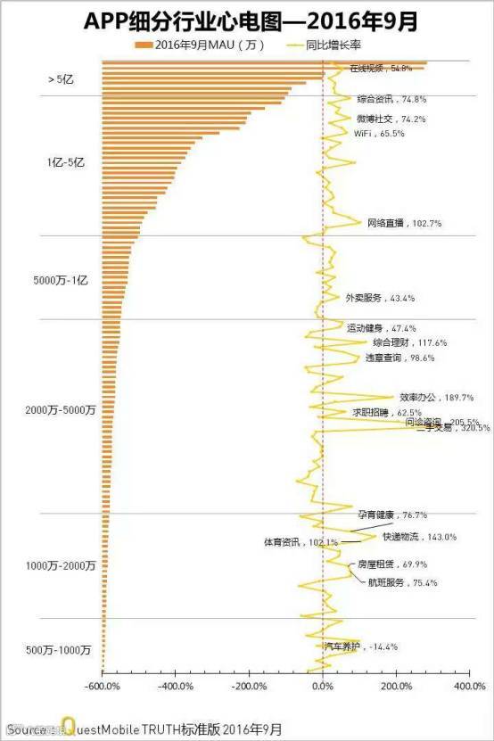 在时刻被互联网所改变的今天,到底什么行业的变革是最大的?下一张QuestMobile截止2016年9月的APP应用心电图就能看到明显的特征:娱乐行业是最适合连接互联网应用的传统行业,大量MAU超过5亿的头部应用都来自于娱乐。整个娱乐行业今年一直在风口上,用户付费增加,商业模式从UGC到PGC,视频内容从点播到直播再到社交。成为了经济增速下行中为数不多的亮点。