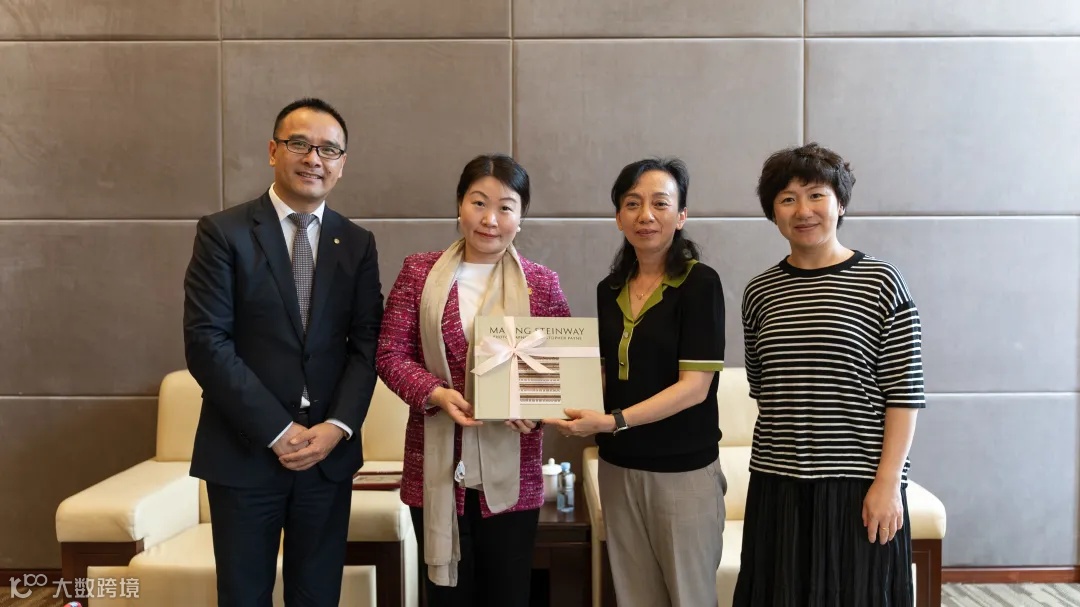 施坦威亚太区总裁位炜女士(左二)、施坦威亚太区销售总监吴坚先生(左一)向电子科技大学党委副书记彭岚女士(右二)、电子科技大学大学生文化素质教育中心主任韩蕾女士(右一)赠送《Making Steinway》书籍