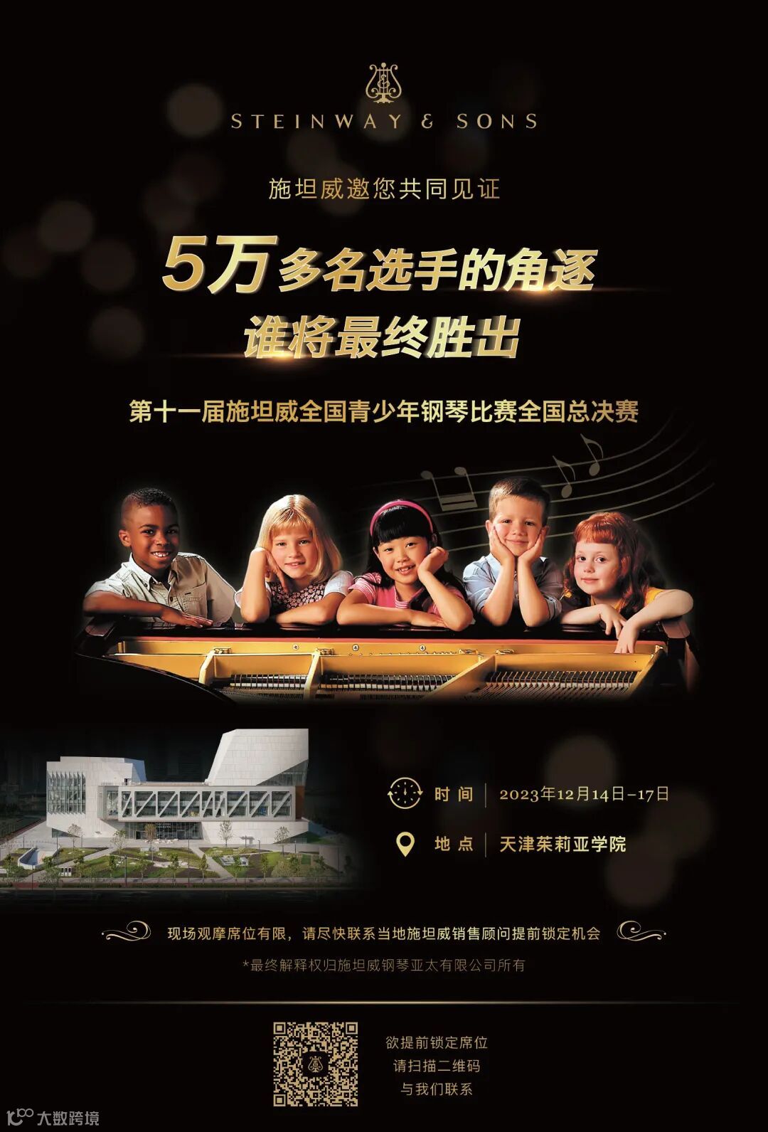 由施坦威钢琴亚太有限公司主办的第十一届施坦威全国青少年钢琴比赛总决赛将于12月14日至12月17日,于天津绚丽开启。本届比赛于2023年5月在全国拉开帷幕,共有来自全国各地46个预选赛赛区,13个分赛区的超过52,000名选手报名参加,为参赛规模最大、参赛人数最多的一届。经过7个多月的激烈角逐,最终有113位业余选手和54位专业选手胜出,成功入围总决赛。