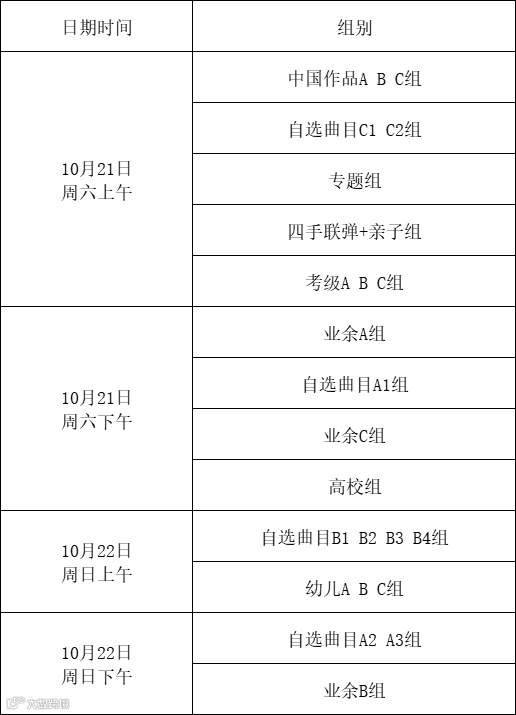 第十一届施坦威全国青少年钢琴比赛东北一区决赛(业余组)将于2023年10月21-22日举行,现将各组别赛程公布如下,请参赛选手按照工作人员通知到的时间签到候赛,预祝选手们比赛顺利!