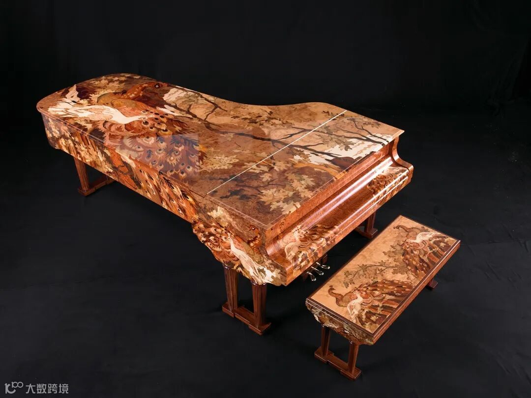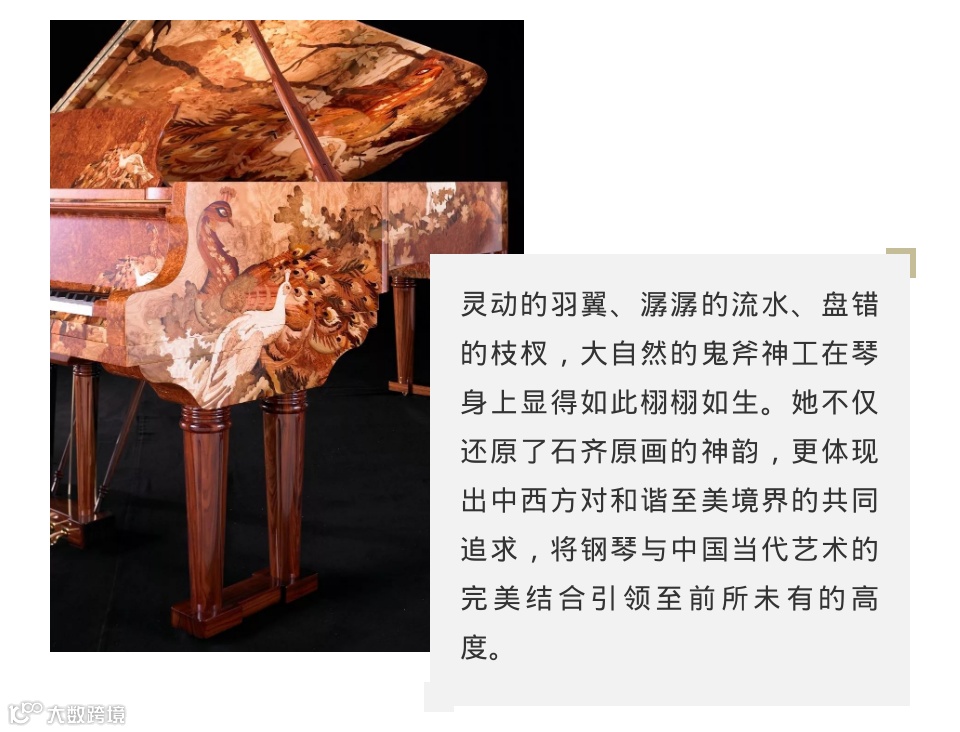 谈及钢琴与中国当代艺术的完美结合,施坦威艺术外壳钢琴“和谐之声”无疑是最杰出的代表作之一。她由痴迷于艺术品收藏的中国收藏家郭庆祥先生定制,以中国著名当代画大师石齐于1989年创作的中国画名作《孔雀》为蓝本,使用40余种不同珍稀木材历时四年全手工打造。