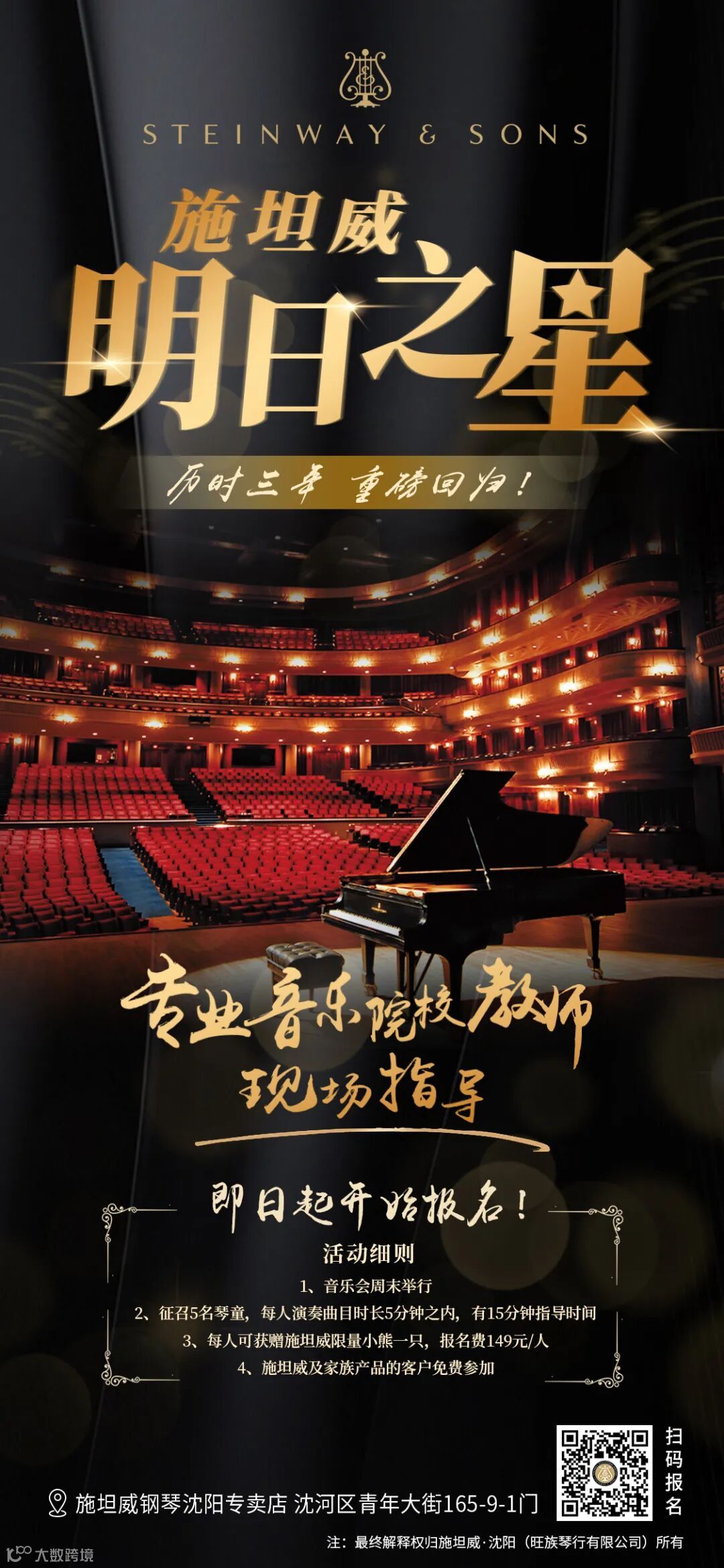 此刻,施坦威·沈阳全新升级,音乐会场地重新对外开放,音乐会形式也持续进化。在延续音乐会系列的基础之上,为琴童们提供一个更广阔的交流空间。我们将邀请来自沈阳和全国各大音乐院校的专业教师亲临现场,为琴童们进行现场指导。无论是初学的幼童,还是准备参加考级、比赛的学生,或是即将迈入专业院校学习的未来音乐家,都将与名琴、名家、名师近距离接触。旺族琴行施坦威专卖店在新的一年重新启航,为你的音乐之路保驾护航!