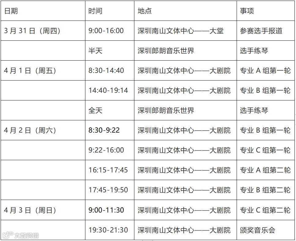 3.组委会严格执行练琴与比赛安排,请各选手与家长认真计划在深圳的出行安排,按规定时间准时抵达练琴与比赛场馆。深圳交通情况复杂,上下班高峰时间较其他时间更为拥堵,请各位家长及选手务必预留足够的时间,以保持良好的状态。