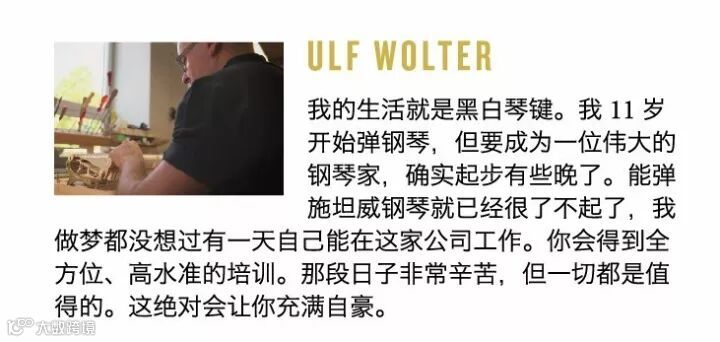 施坦威为什么还始终坚持手工制作?因为施坦威钢琴有12,000个零件,这些零件多由实木、毛毡等天然材质制成,就算是经验丰富的制琴师,也得调用视觉、触觉、听觉等多种感知力才能发现并处理细微的差别。想成为施坦威制琴师的难度不小,要先学一年半基础知识,再跟着师傅实习一年半,过了前三年还得考试,通过了才能进门当制琴师。无论是经验丰富的制琴大师,还是刚刚入门的年轻学徒,一代又一代的施坦威匠人数十年如一日地打造最高品质的钢琴。