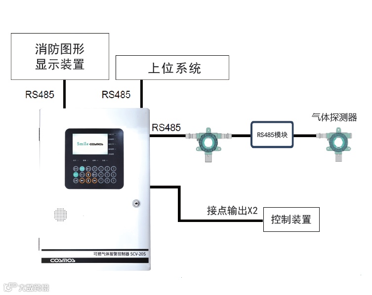 同时,以RS485通信方式向上位系统、消防图形显示装置发送报警信号,并根据可设置的探测器与接点的联动关系,启动外部接点输出、RS485模块联动等功能,以避免发生爆炸、火灾等事故。