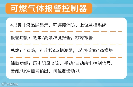 总线制燃气泄漏报警系统通过餐饮、商务楼宇等场所设置的可燃气体探测器GT/GY-SKD20传送的气体浓度信号,对气体泄漏进行早期检测,当气体浓度值达到机器报警设定值时发出报警信号。