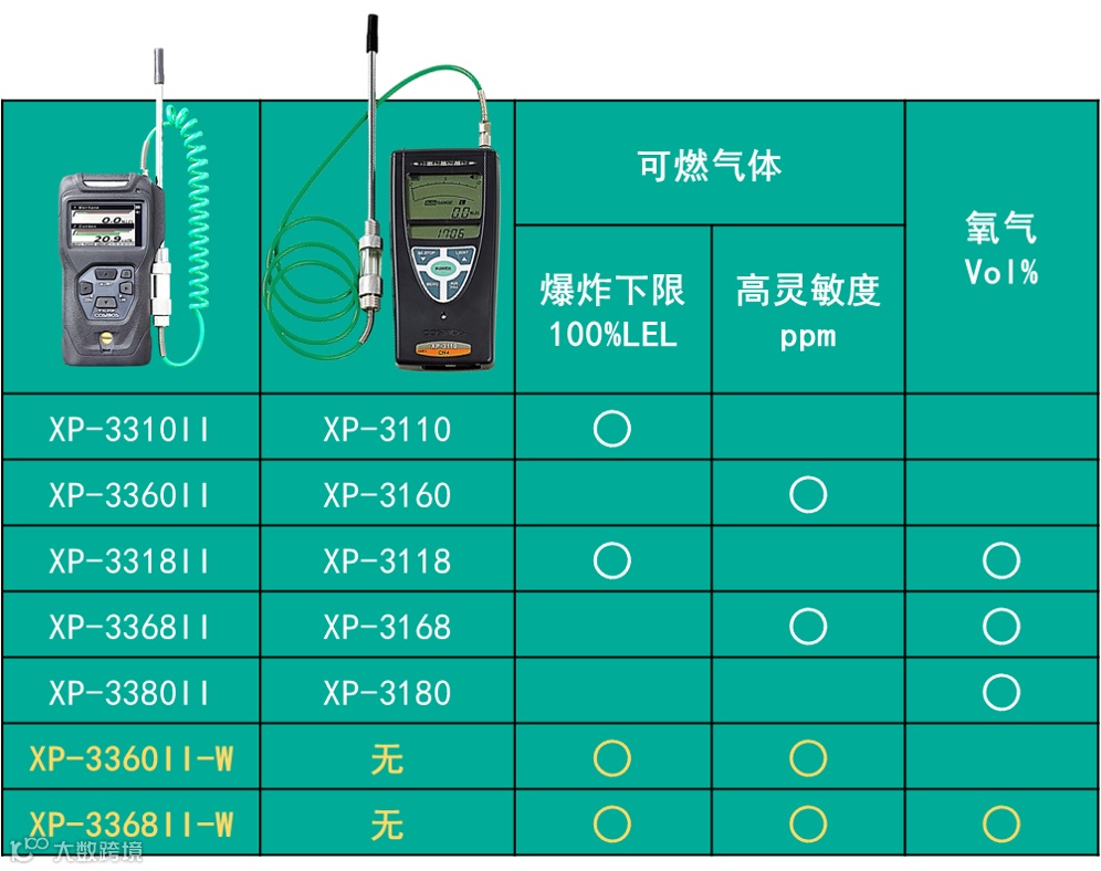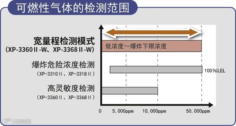 宽量程检测模式(XP-3360Ⅱ-W、XP-3368Ⅱ-W),可用1台设备解决低浓度到爆炸危险浓度的检测,可检测旧款2台才能检测的范围,提高了工作效率和削减维护费用。