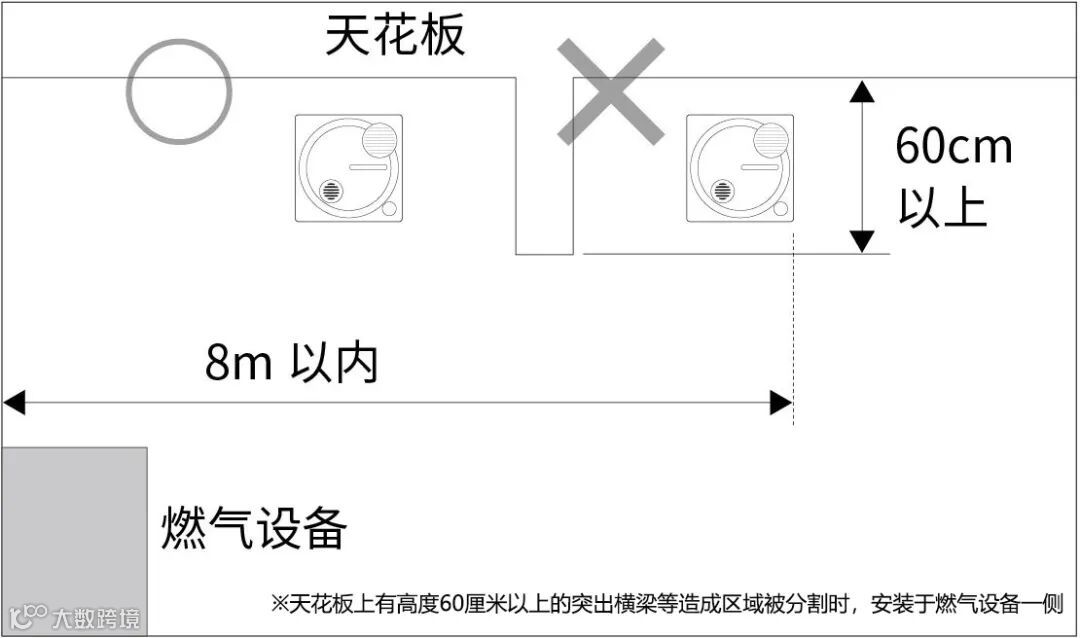 安装在与被探测天然气、产生一氧化碳的设备水平距离8米以内,从报警器底面到天花板面距离30厘米以内。 |