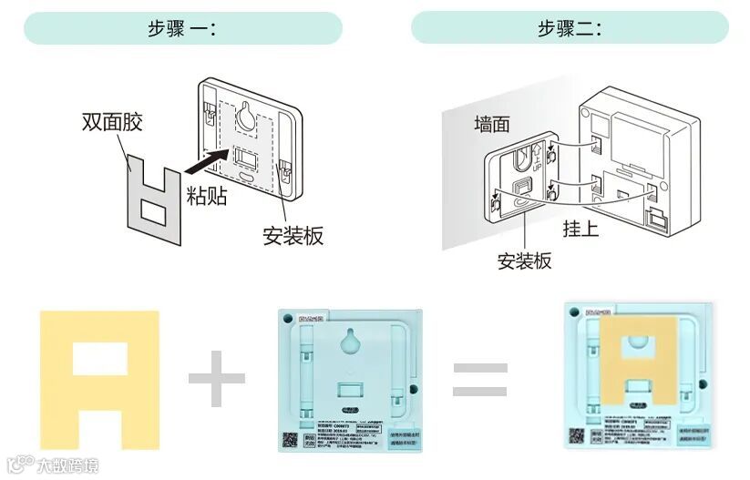 将附赠的双面胶粘贴在安装板背面,并且粘贴固定在墙面。(也可以选择使用附赠的螺丝进行固定)
