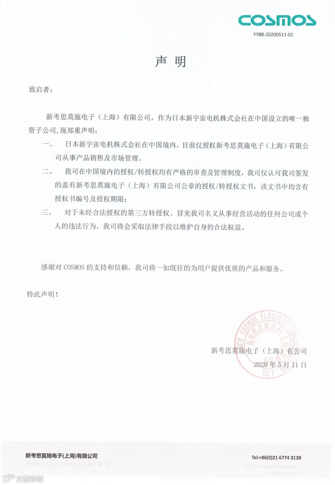 )有限公司,作为日本新宇宙电机株式会社在中国大陆设立的唯一独资子公司,现郑重声明如下: