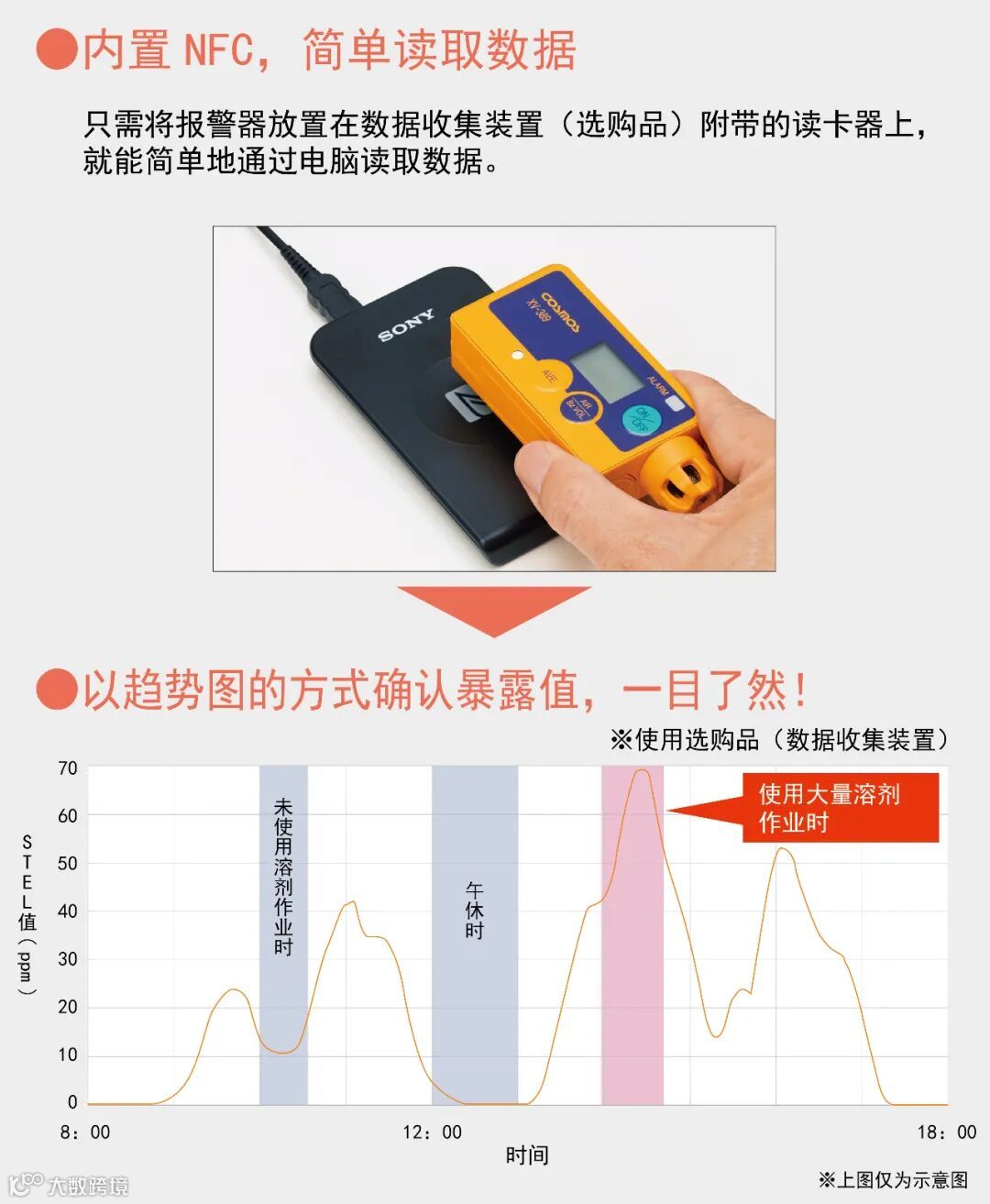 使用NFC读取数据,简单方便的采集数据,化学物质的暴露值以趋势图方式进行确认管理。 |