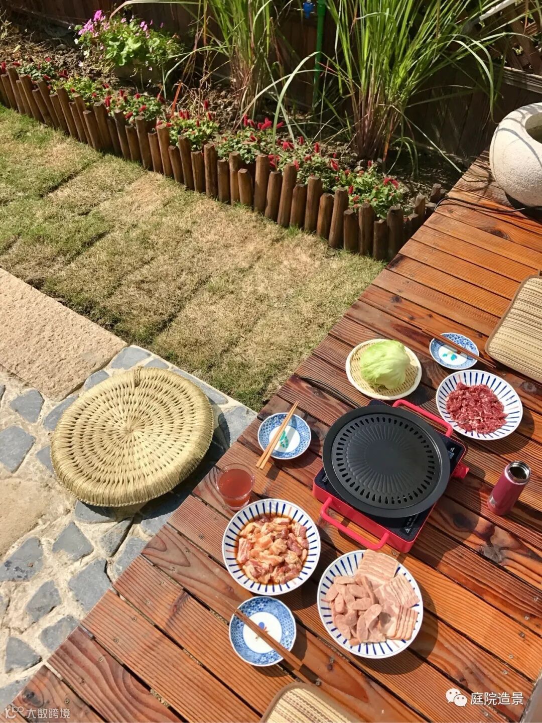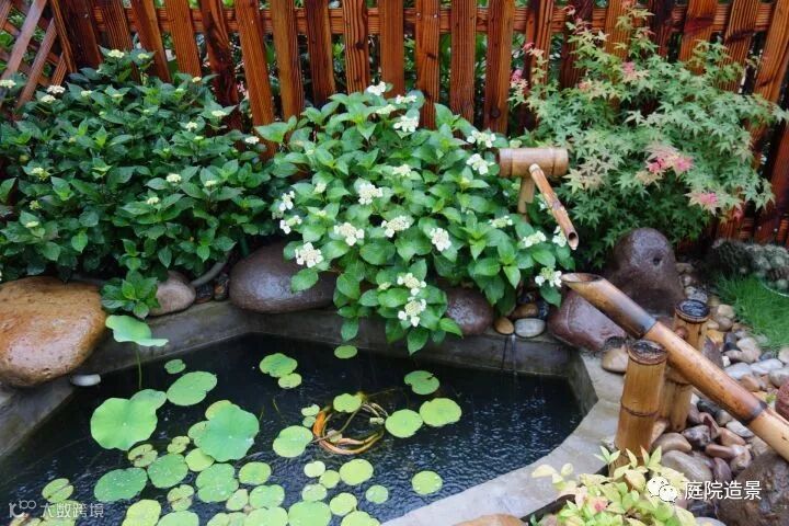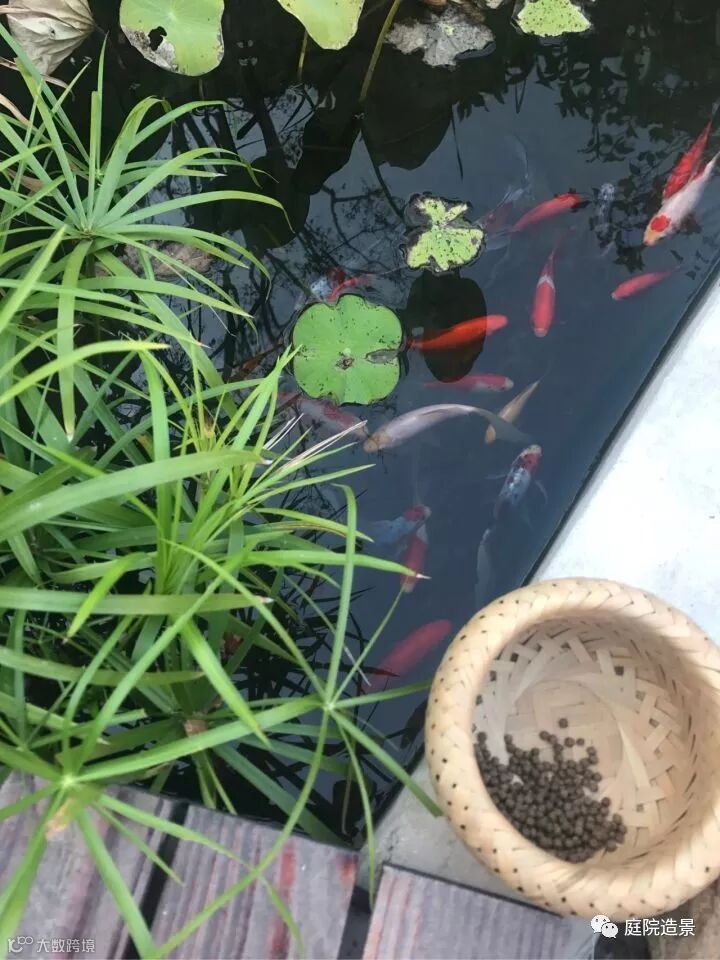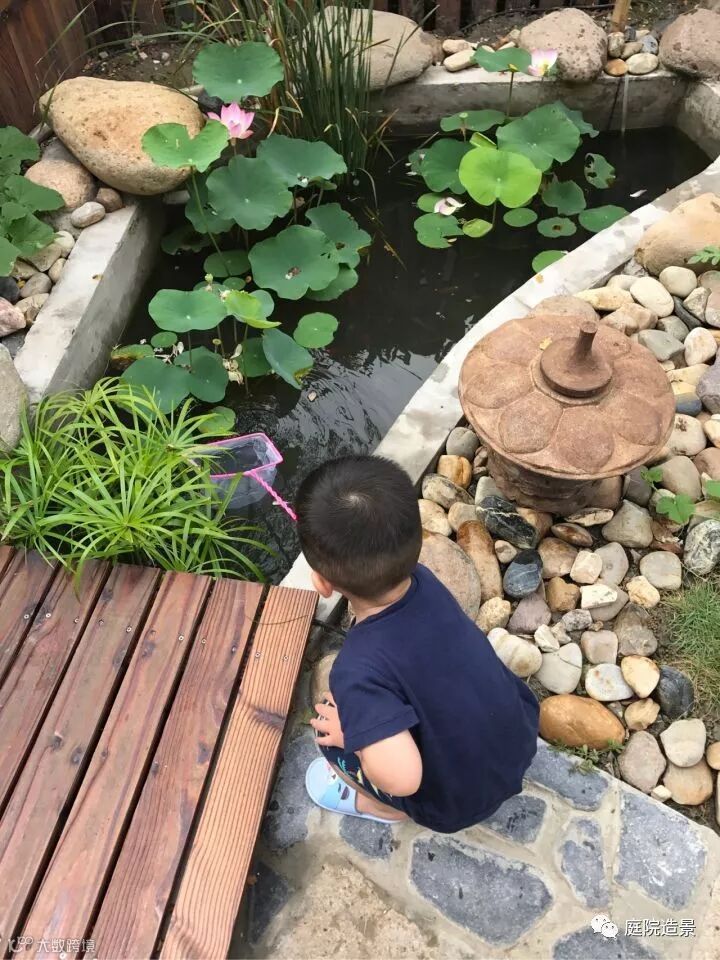 很喜欢主人预留出两处防腐木平台的位置,一处衔接室内落地玻璃门与小院,一处在小池塘边。主人的想法是鱼池边的木平台正经功能当然是用来观赏鱼池的。水中荷叶与金鱼的相互依偎,让我想到鱼戏莲叶间,鱼戏莲叶东,鱼戏莲叶西......自然又是一份惬意悠然的小世界啊。