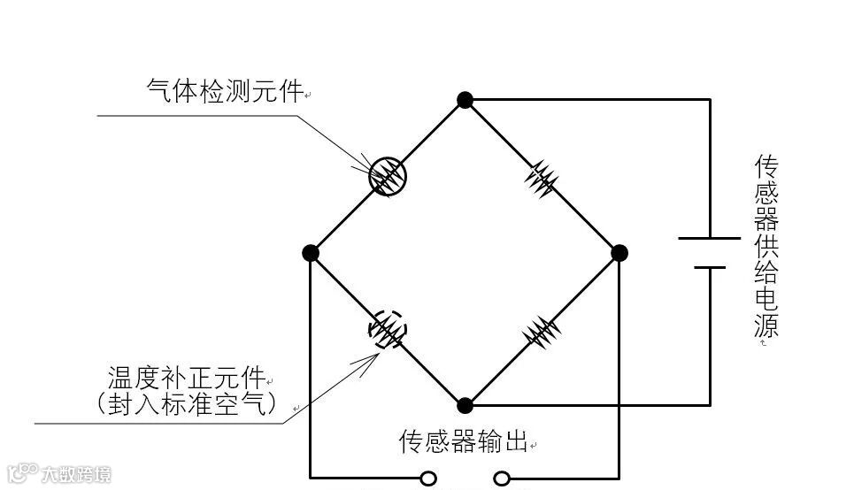 传感器元件由两个温度计,即『检测元件』和『温度补正元件』构成。『检测元件』外露在检测环境中,『温度补正元件』密封于标准气体之中。