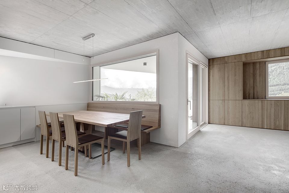 地面上的丰富纹理使人联想到精细的打磨和填充过程;混凝土材质的天花板、墙壁和房间门通过白垩色的饰面形成统一;实木家具更带来温暖而舒适的居住氛围。