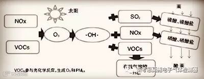 说到雾霾,雾霾和PM2.5经常联系在一起,空气中PM2.5来源主要有两个:一是直接排放一次源,它有自然源,交通扬尘、农田扬尘、风的扰动下造成排放。二是人为源,它有工业生产过程排放、机动车行驶过程中造成的排放。除自然源和人为源之外,通过排放到大气当中二氧化硫、氮氧化物和VOCs在空气当中满足一定条件化学反映,形成硝酸盐、硫酸原和二次有机其溶剂从而造成PM2.5浓度的升高。